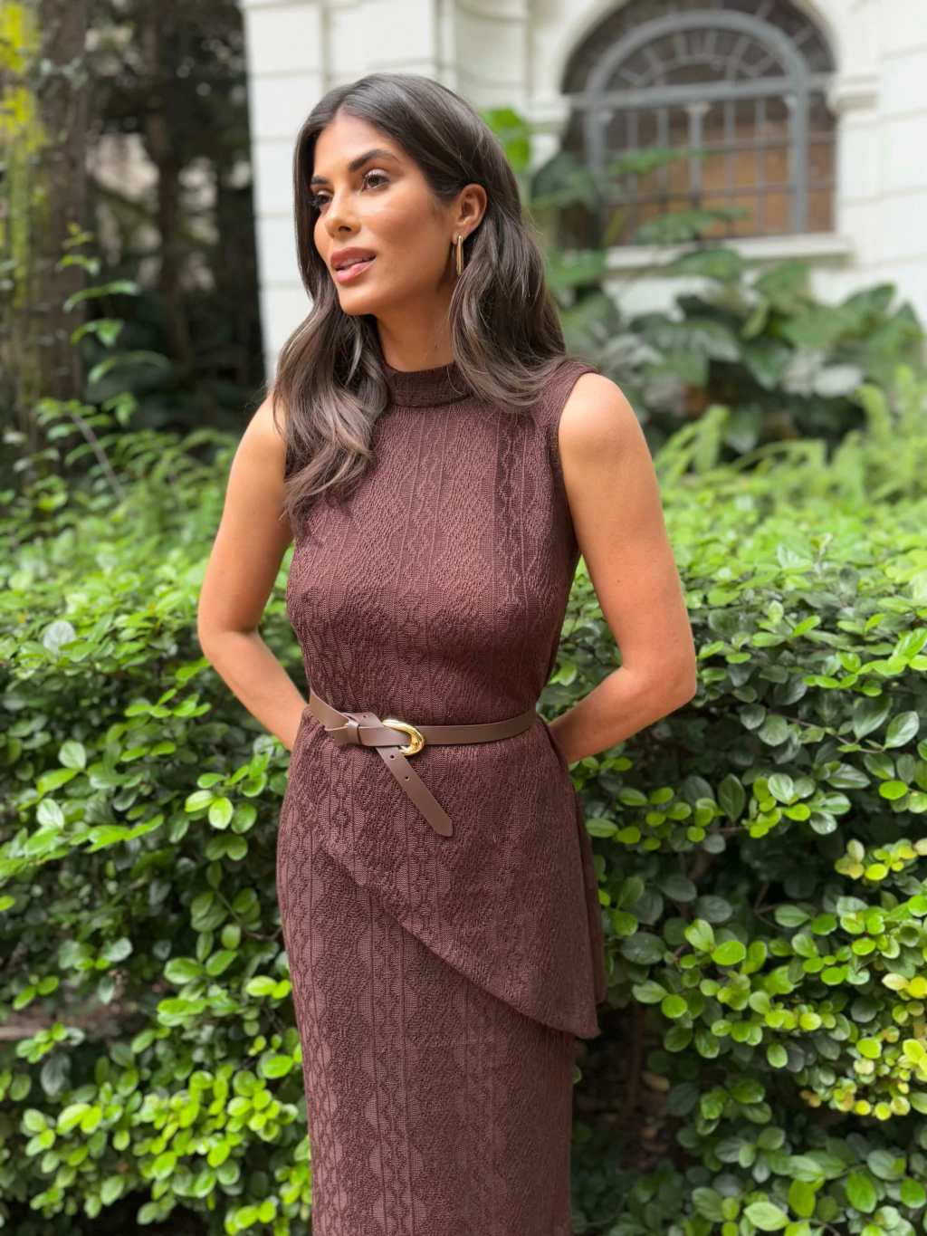 Blusa em malha trabalhada, sem mangas, gola alta, base assimétrica e fechamento por zíper nas costas.