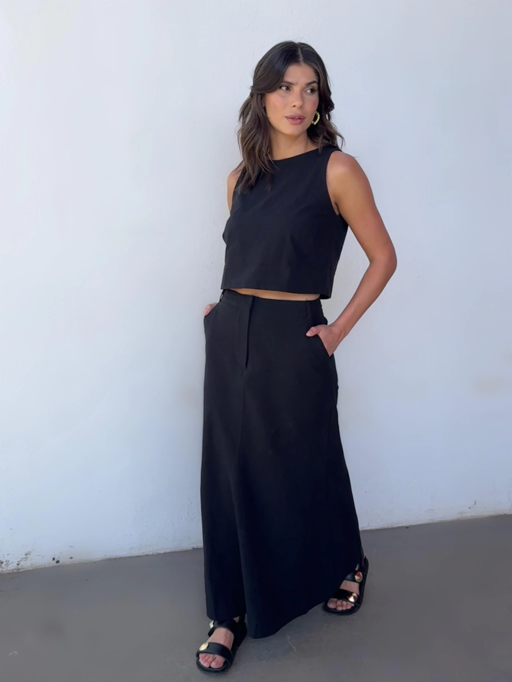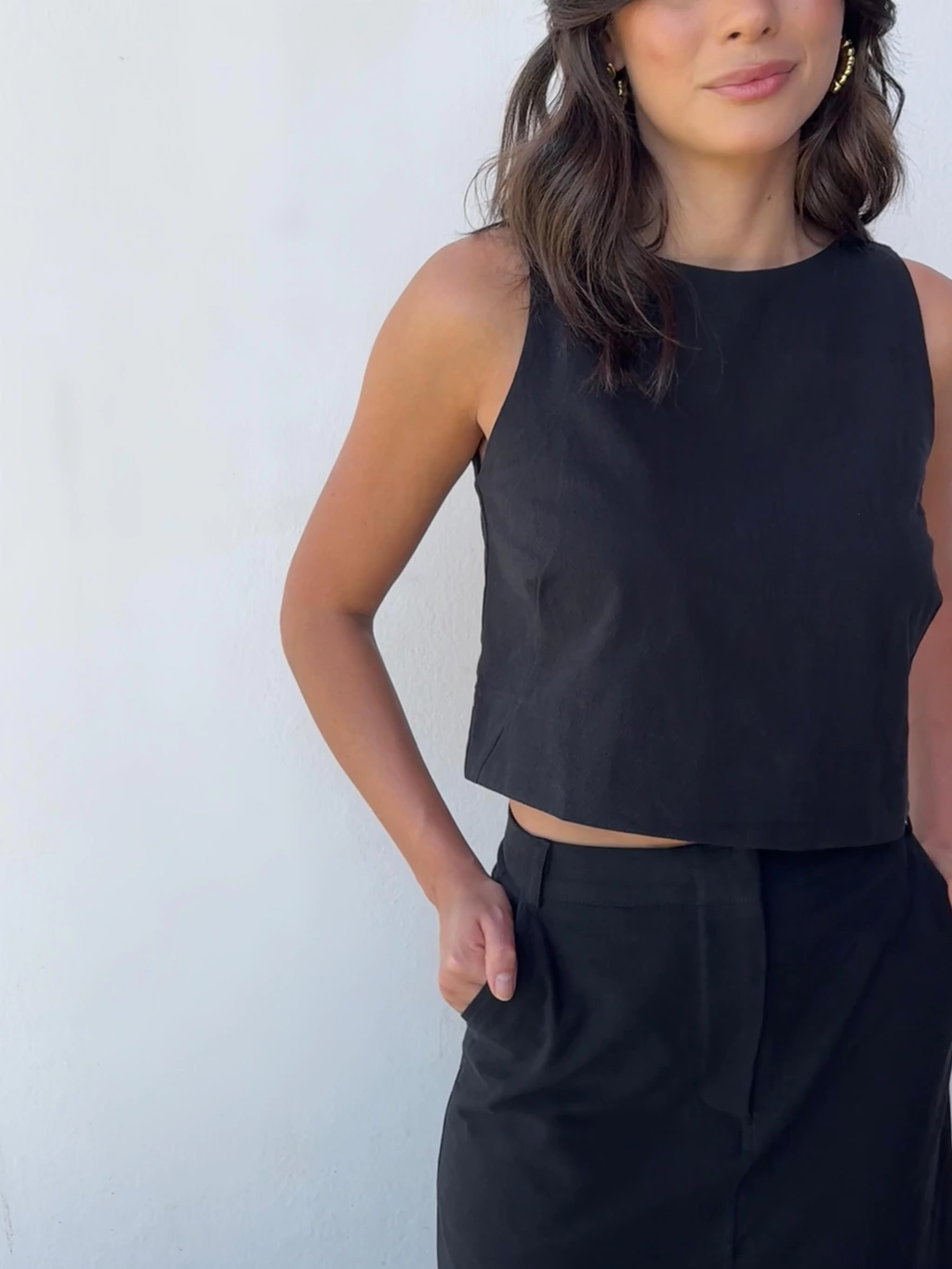 Blusa sem mangas, comprimento mais curto, ideal para usar com peças de cintura alta.