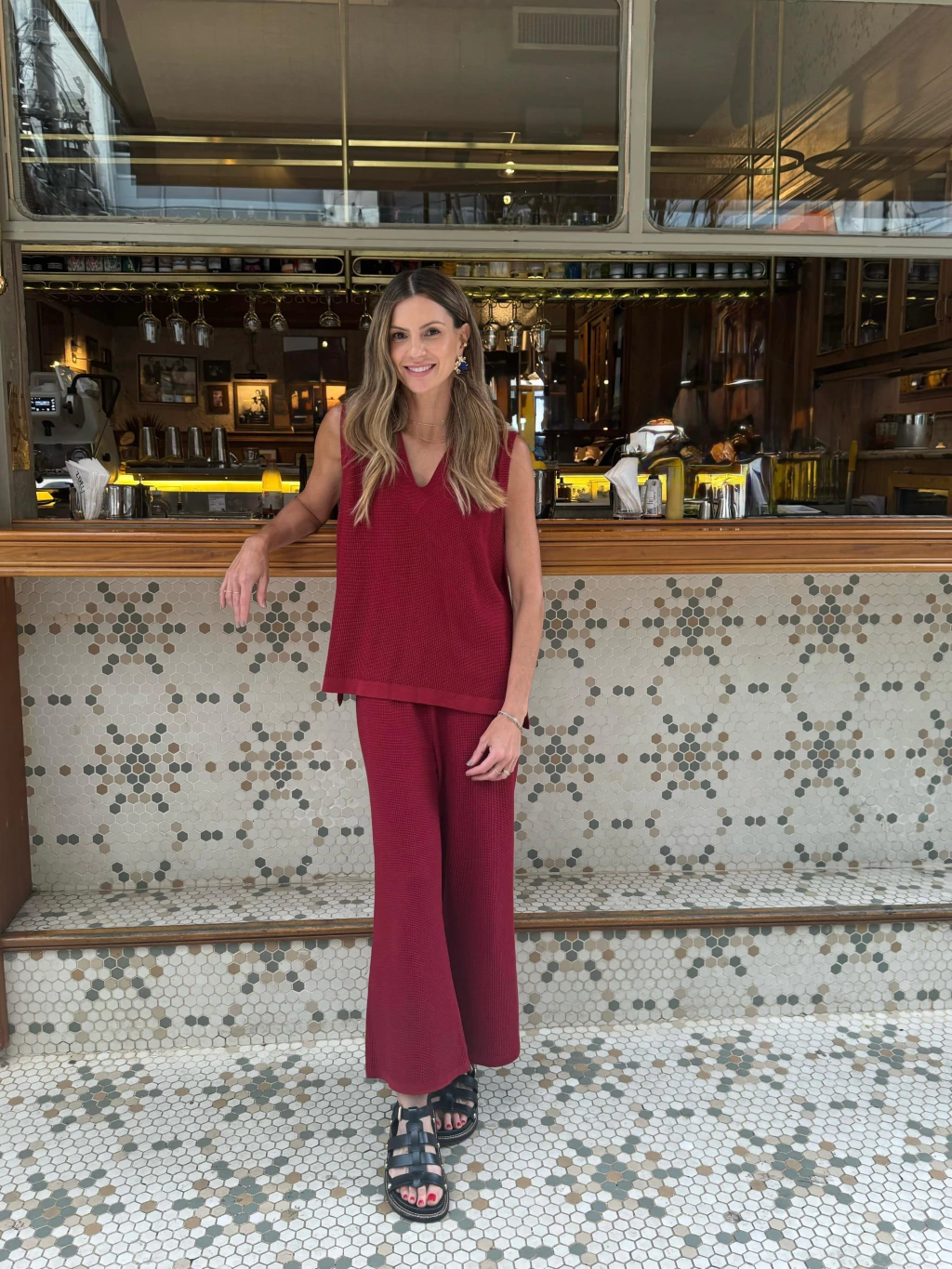 Conjunto em tricot, calça em cós de elástico e blusa sem mangas com gola em V.Composição: 70% viscose / 30% poliamidaIndicação tamanho: P/M - 36 a 40