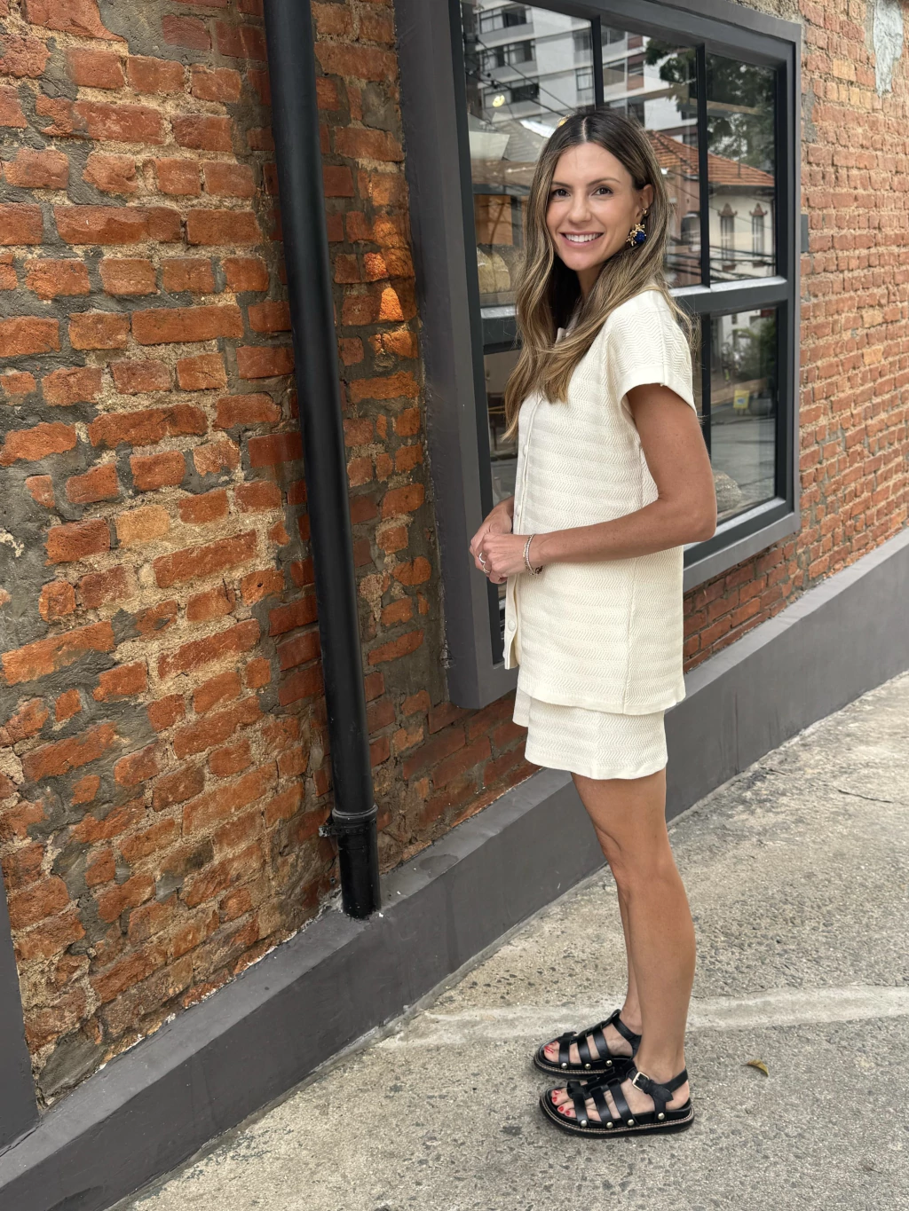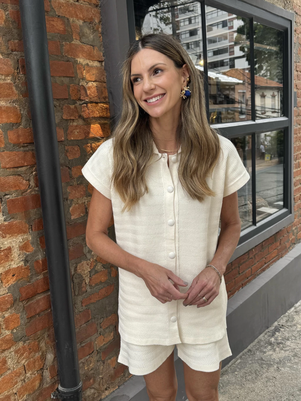 Conjunto em tricot.Shorts em cós de elástico e blusa manga curta com fechamento por botões forrados. Composição: 70% viscose / 30% poliamidaIndicação tamanho: P/M 36 a 40
