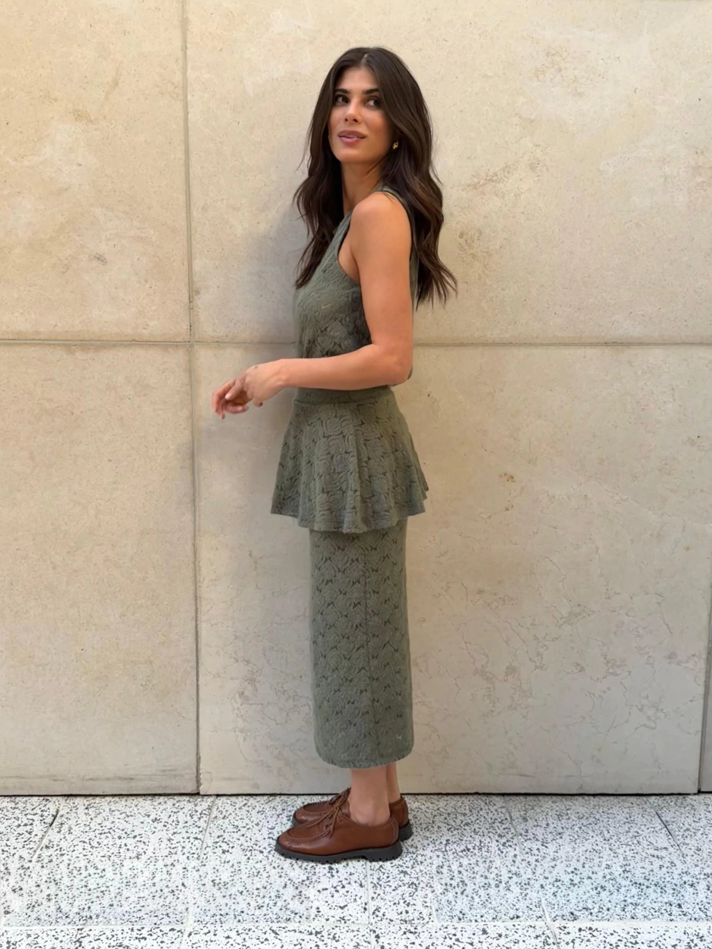 Saia midi em malha rendada , fenda posterior, cintura alta com fechamento por zíper de mteal.