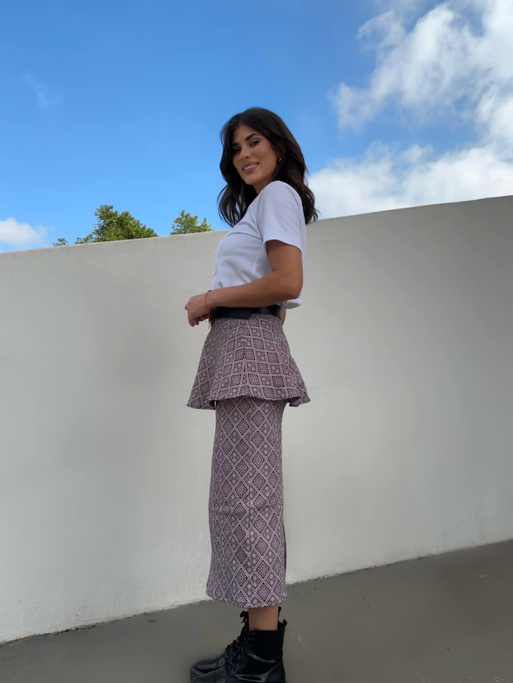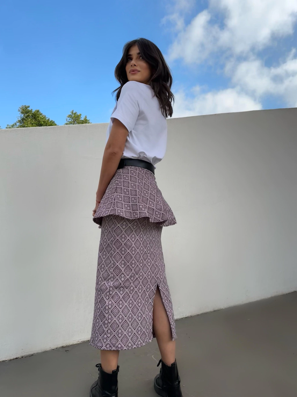 Saia midi em renda, fenda posterior, cintura alta com fechamento por zíper.