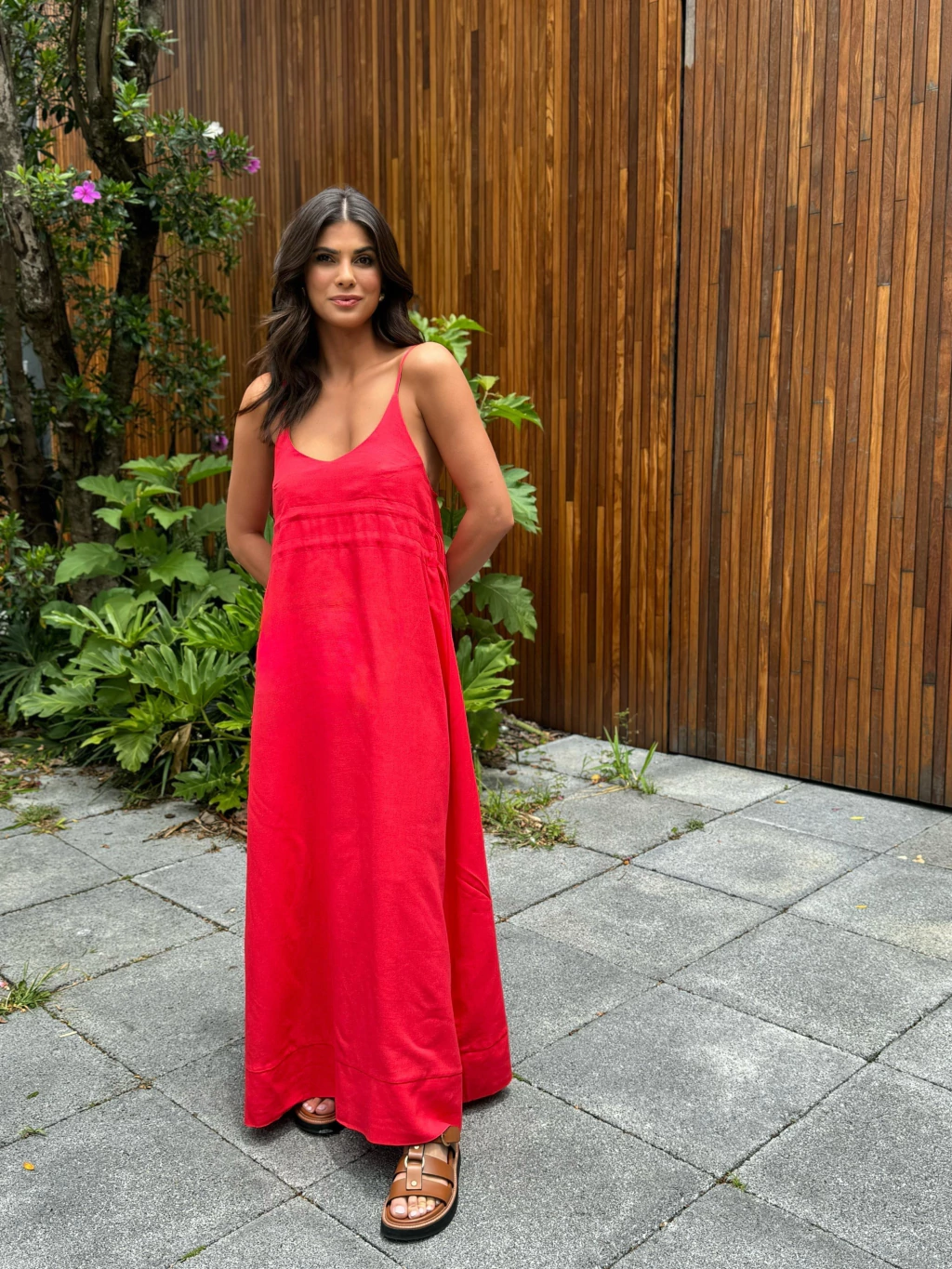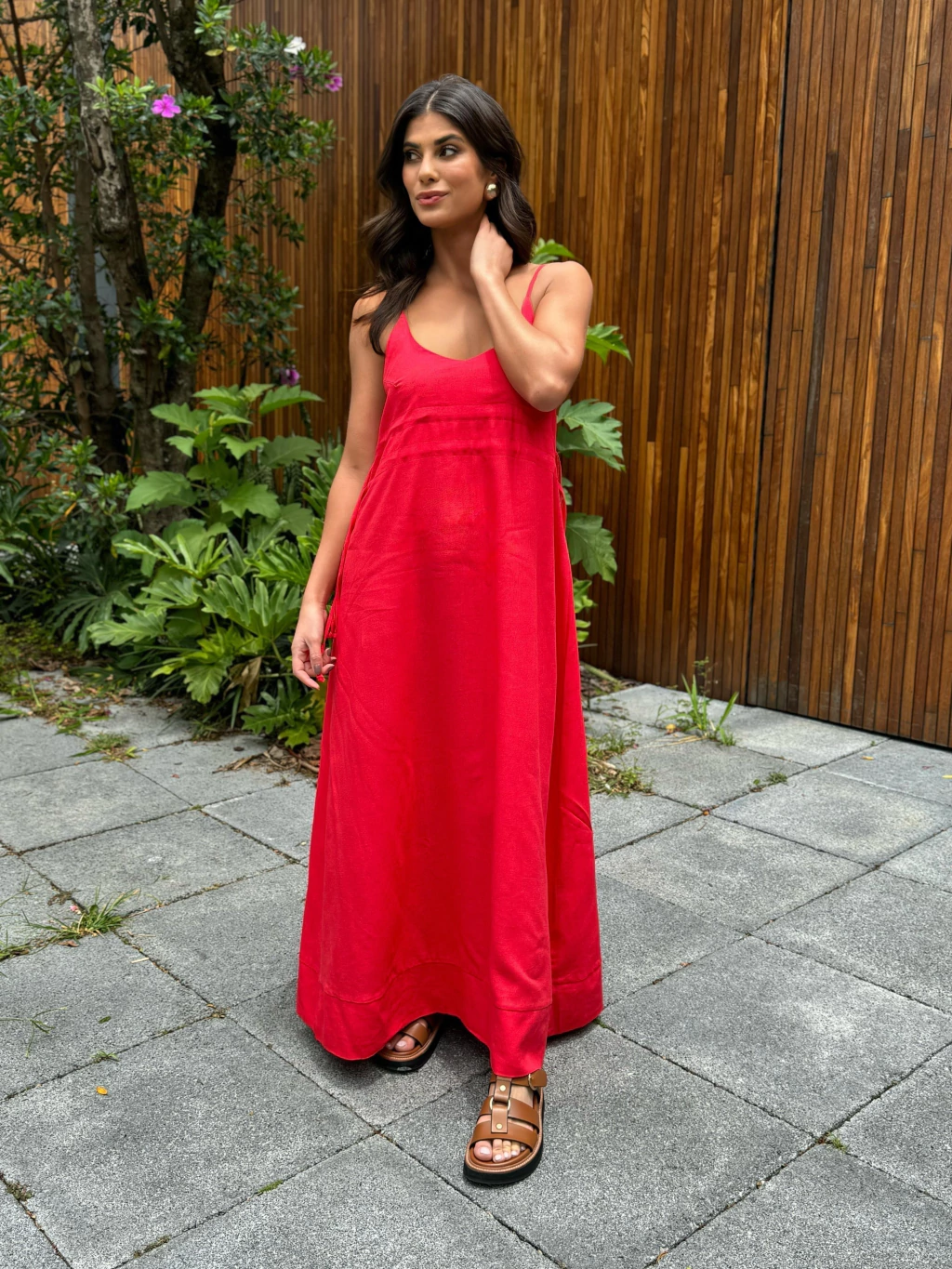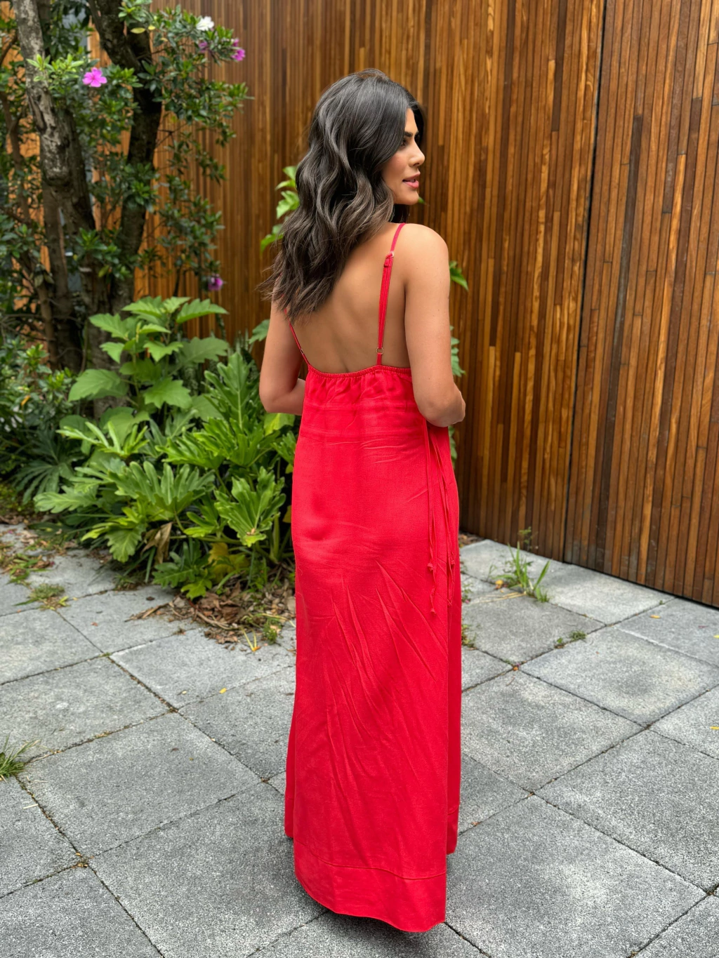 Vestido midi longo, top com decote, ajuste com alças reguláveis abixo do busto, alças com regulador.