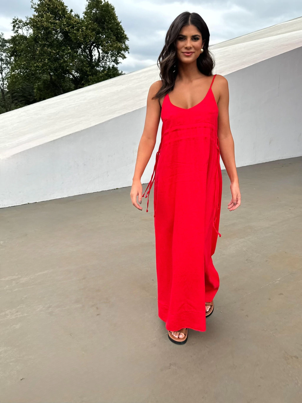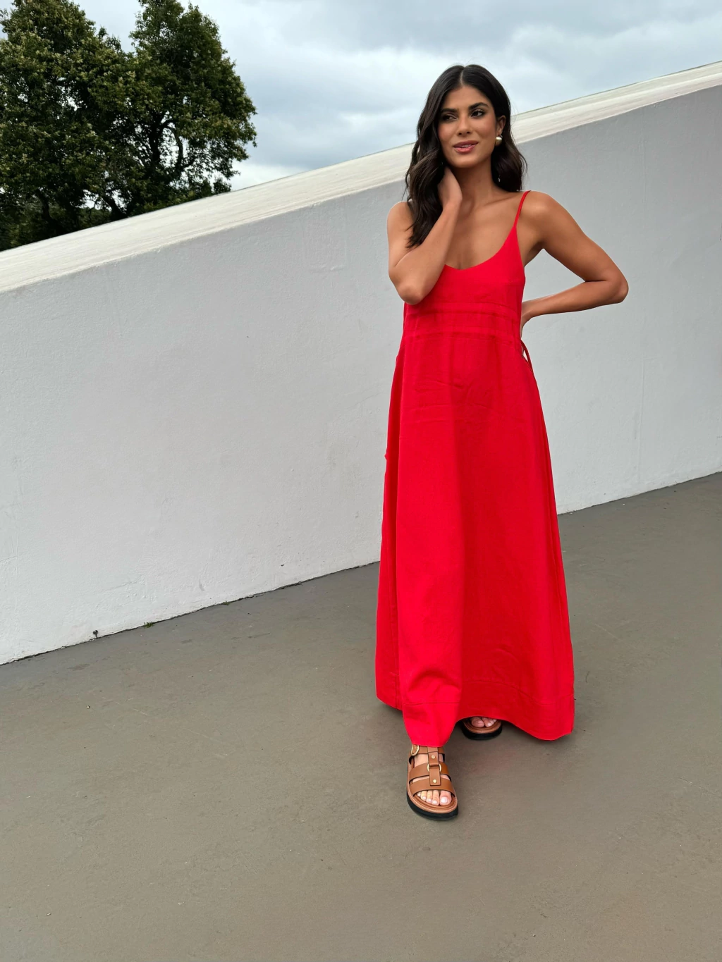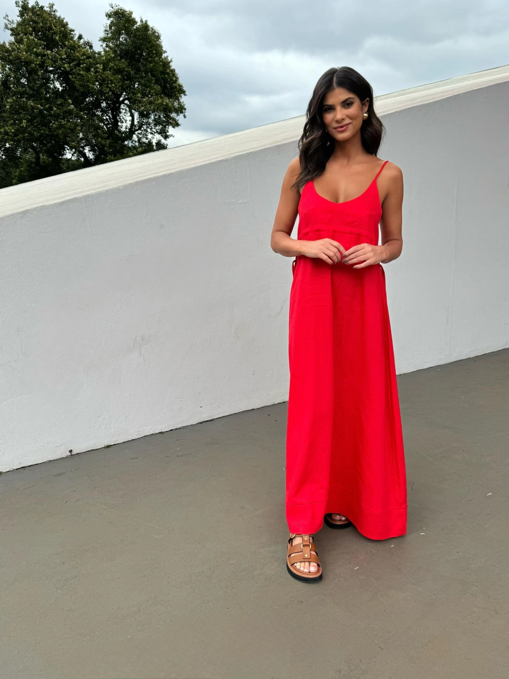 Vestido midi longo, top com decote, ajuste com alças reguláveis abixo do busto, alças com regulador.