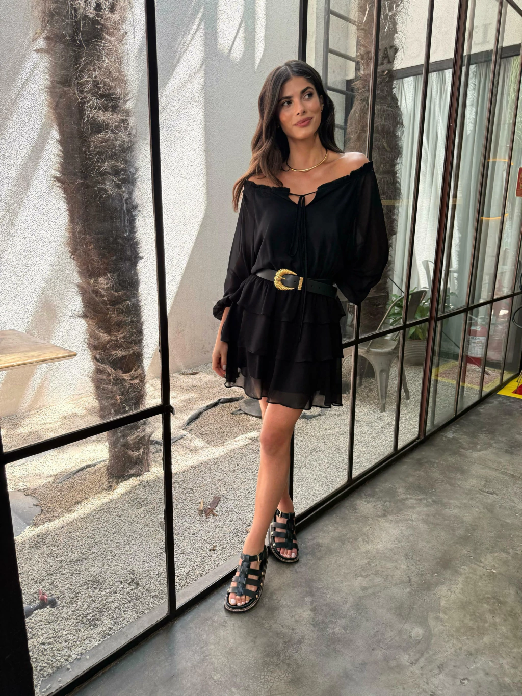 Vestido curto com amarração frontal, elástico na cintura , mangas longas.