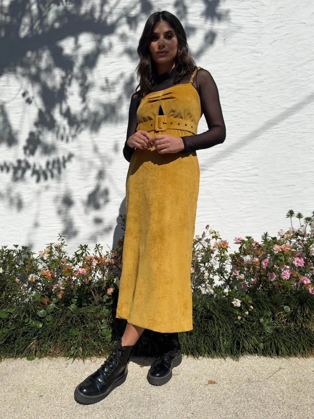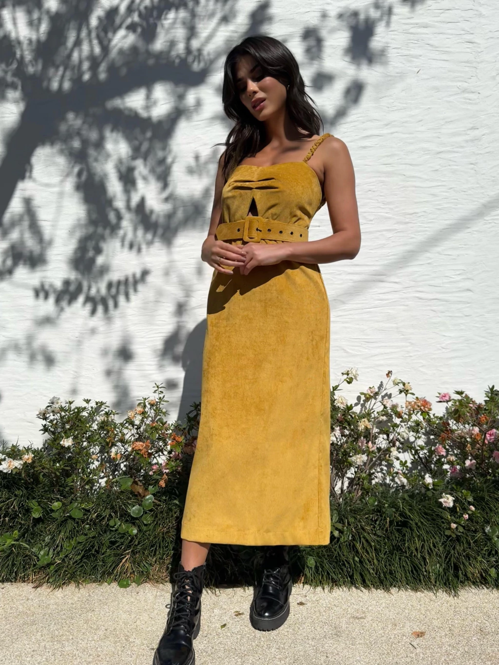 Vestido comprimento midi em veludo cotê, fenda nascostas, busto mais justo ao corpo, fechamento posterior com ziper de metal, acompanha cinto do mesmo tecido avulso.