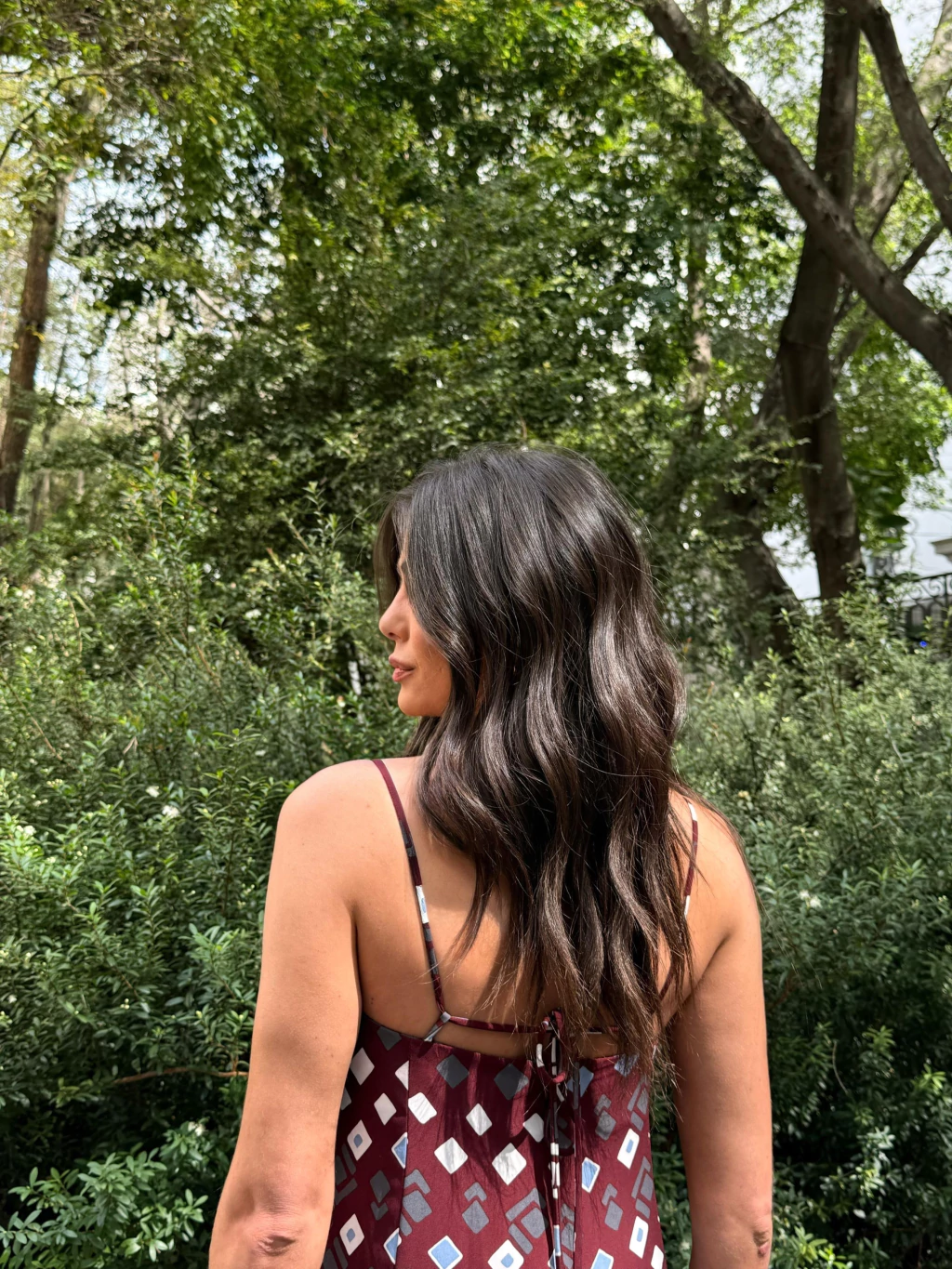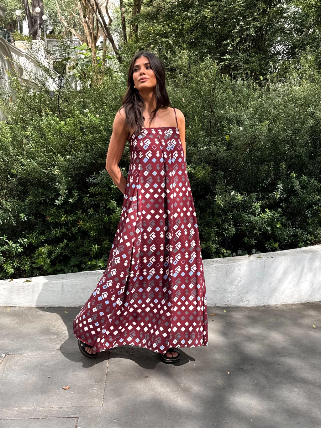 Vestido comprimento midi, decote quadrado, prega frontal, alças com regulagem por amarração e zíper invisivel nas costas.